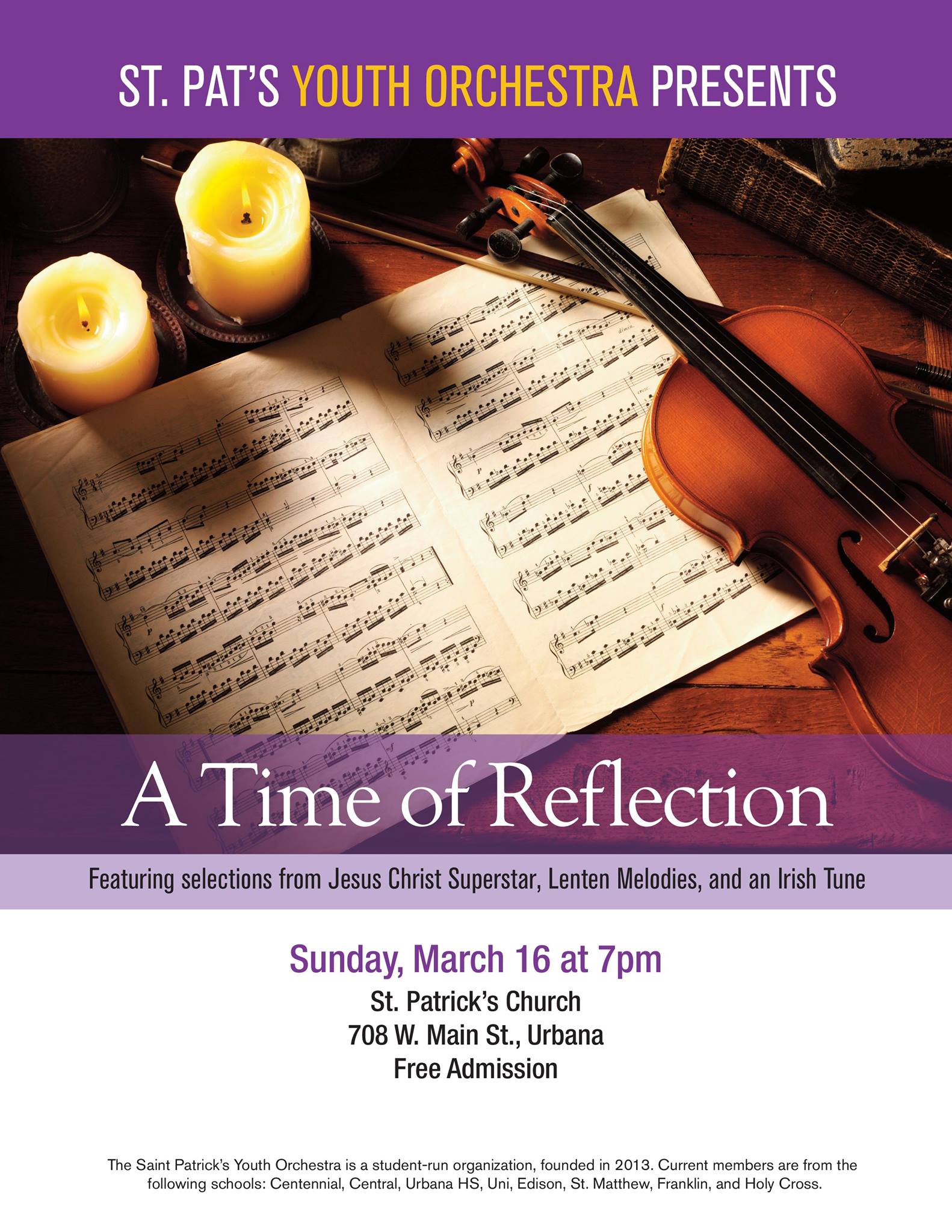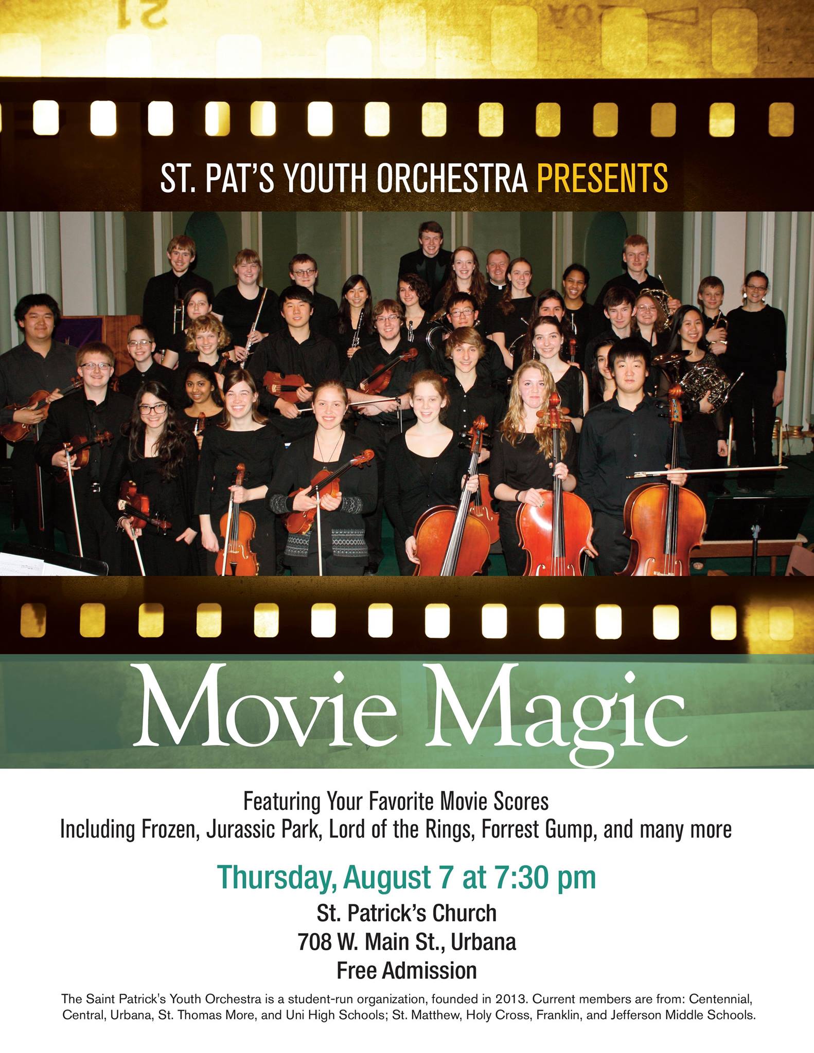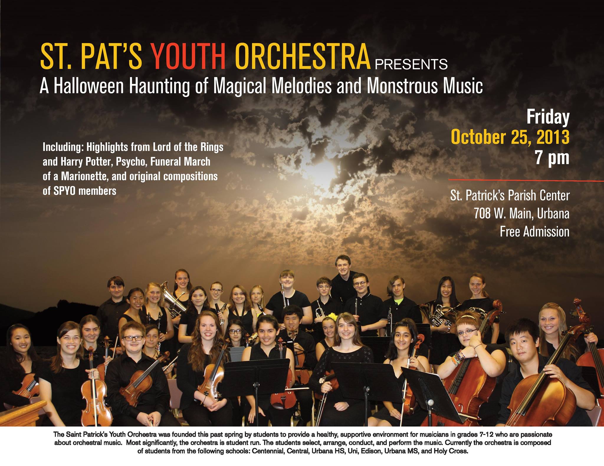 The St. Patrick’s Youth Orchestra performed a Halloween concert at 7 P.M. on Saturday, October 25, 2014 at the St. Patrick’s Parish Center, 708 W. Main Street, Urbana. “Boo-tiful Music” featured selections from Phantom of the Opera, Pirates of the Caribbean, Psycho, Peer Gynt, and more.